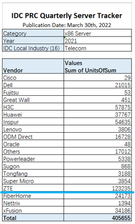 今年3月底,全球知名数据调研机构国际数据公司 (IDC) 发布了2021年全球服务器出货量和营收排名报告。该报告显示,在电信领域,2021年中兴通讯x86服务器发货量和收入均为第一。发货量12.3万台,约占电信领域30+%。