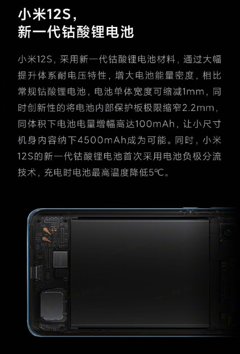 据介绍,小米12S采用了新一代钴酸锂电池材料,通过大幅提升体系耐电压特性,增大电池能量密度,相比常规钴酸锂电池,电池单体宽度可缩减1mm,同时创新性的将电池内部保护板极限缩窄2.2mm。