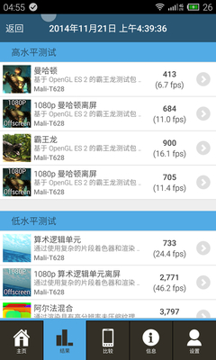 而在图形芯片方面,所集成的Mali-T628@MP6相比于高通骁龙801确实还有不少差异。三者在2D绘图方面基本一致,而在3D图形方面,高通骁龙801所集成的Adreno330还是领先不少,而Mali-T628@MP6基本和PowerVR G6200旗鼓相当,3D图形方面依旧是高通芯片的优势所在,不过三者之间的差距也越来越小。而从实际体验来看,无论是这三种芯片中的哪种,在运行大型游戏或是有高规格的图形需求时都能完全胜任。