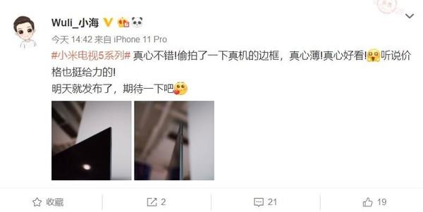 11月4日,数码博主@Wuli_小海 曝光了两张小米电视5的真机图片。曝光的图片显示,小米电视5非常薄,而且大概率会采用全面屏的设计。同时,该博主表示,小米电视5的价格也很给力。其实,官方已经公布了小米电视5的一些信息。