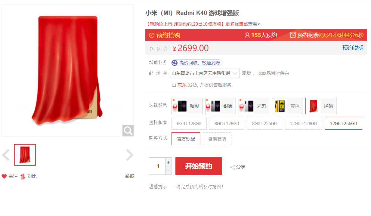 据IT之家网友 @考古队长 投递的线索,小米已在电商平台上架了 Redmi K40 游戏增强版的“逆鳞”配色,该机只有 12GB + 256GB 版本,售价 2699 元,比普通版贵 200 元,已开启预约。