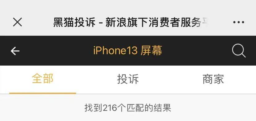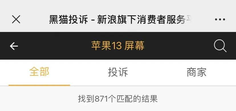 而在黑猫投诉平台上,《消费者报道》同样发现了不少类似案例,本刊检索“苹果13屏幕”“iPhone13屏幕”关键词时发现,结果显示分别有871条、216条投诉内容。本刊留意到,这些投诉内容发生时间在2021年9月开售之初至今。