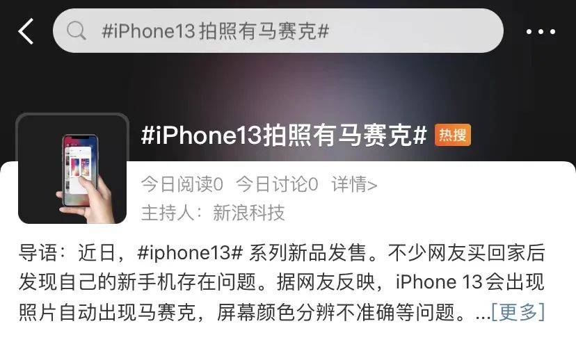 2021年9月,#iPhone13拍照有马赛克#话题冲上微博热搜,部分iPhone13系列的第一批用户表示,iPhone13拍照有马赛克、屏幕颜色分辨不准确等问题。对此,苹果公司中国客服表示,没看到有用户来电反映过照片马赛克问题。此外,暂时没收到相关的照片、视频、显示屏等问题反馈。