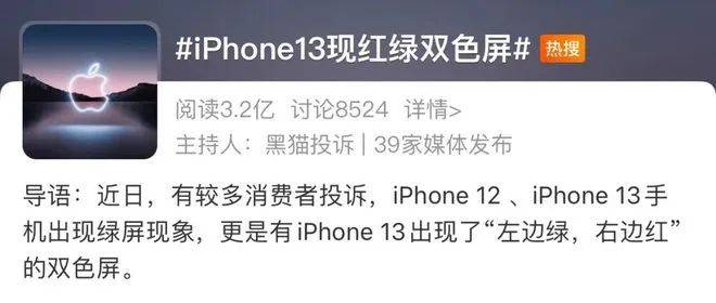 2021年12月,#iPhone13现红绿双色屏#登上微博热搜,遭到众多网友吐槽。消费者遇到的绿屏情况各有不同,有的是屏幕上的绿色随时间逐渐加深,有的则是屏幕出现了一边绿一边红的情况,还有网友表示,自己的iPhone屏幕动不动就变粉了。