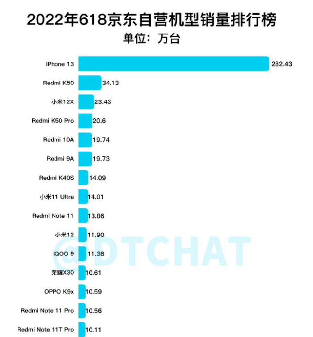 得益于价格策略,iPhone13系列一经发布便在中国市场的广受追捧。根据DTCHAT公布的今年618手机销售榜,iPhone13销量断层式第一,是第二名销量的8倍多。