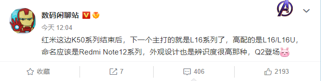 数码博主@数码闲聊站 今日透露,Redmi K50 系列即将到来,小米发布完这一系列之后下一个主打的产品就是 Redmi Note12 系列,开发代号 L16 / L16U,新机外观十分具有辨识度,将于第二季度发布。