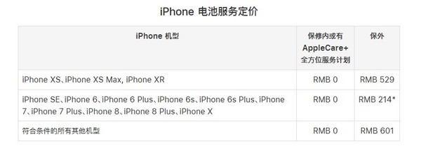 除此之外苹果大幅度调低了更换电池的价格,直至2018年12月31日,对于符合条件的所有iPhone 6或其他机型,保外电池服务的费用为214元。每部iPhone仅限接受一次定价为214元的电池服务。在2018年12月31日后,针对除iPhone X外的所有这些产品,这个费用将会变更为369元,而iPhone X的费用将会变更为529元。