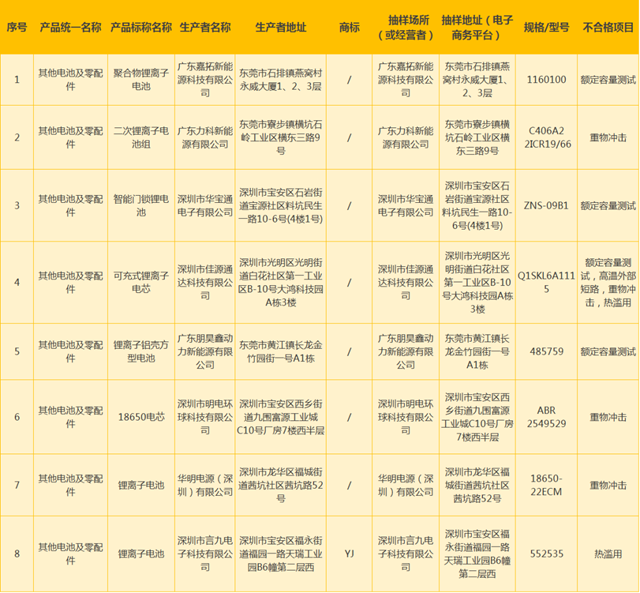 智能设备是人们生活中必不可少的工具,这些设备都离不开电池的支持。依据《广东省电池及其零部件产品质量监督抽查实施细则》,本次共对155家企业生产的锂离子电池、其他电池及零配件等2类346款电池及其零部件产品质量开展了监督抽查,涉及广东省广州、深圳、珠海、佛山、惠州、东莞、中山等7个地市以及北京、河南、湖北、湖南、江苏、江西、浙江、云南等8个省(直辖市)。 本次抽查重点对开路电压、泄漏和变形、放电性能、运输-冲击、运输-振动、不正确的安装、外部短路、过放电、自由跌落、热冲击、强制放电、非正常充电、热滥用、重物冲击等43个项目进行了检验。经检验,发现8家企业生产的8款产品不合格,不合格项目主要有:“额定容量测试”“重物冲击”“高温外部短路”“热滥用”。