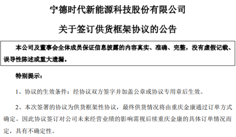 宁德时代称,协议的签订有利于双方建立长期战略合作关系,表示重庆金康对公司动力电池的产品质量和生产能力的认可,进一步验证公司在动力电池领域的竞争力,符合公司和股东