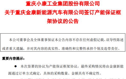 小康股份称,本协议的签订符合公司经营需要,有利于双方建立长期战略合作关系,保障公司动力电池的长期稳定供应,实现产业互动和互利共赢,对公司实施精品战略打造高端智能电动汽车具有积极意义,符合公司发展战略规划。