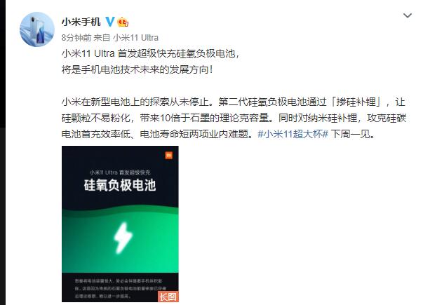 今天小米手机今天宣布,小米11Ultra 首发超级快充硅氧负极电池,可让手机电池更薄、充电更快。