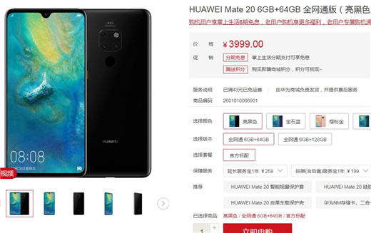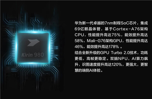 性能配置方面,华为mate20搭载麒麟980芯片,其采用尖端的7纳米制程工艺,集成了69亿个晶体管,相比上一代性能提升20%,能效提升约40%,适配Android 9(Pie)的EMUI9深度定制系统,提供6GB+64GB、6GB+128GB两种版本。