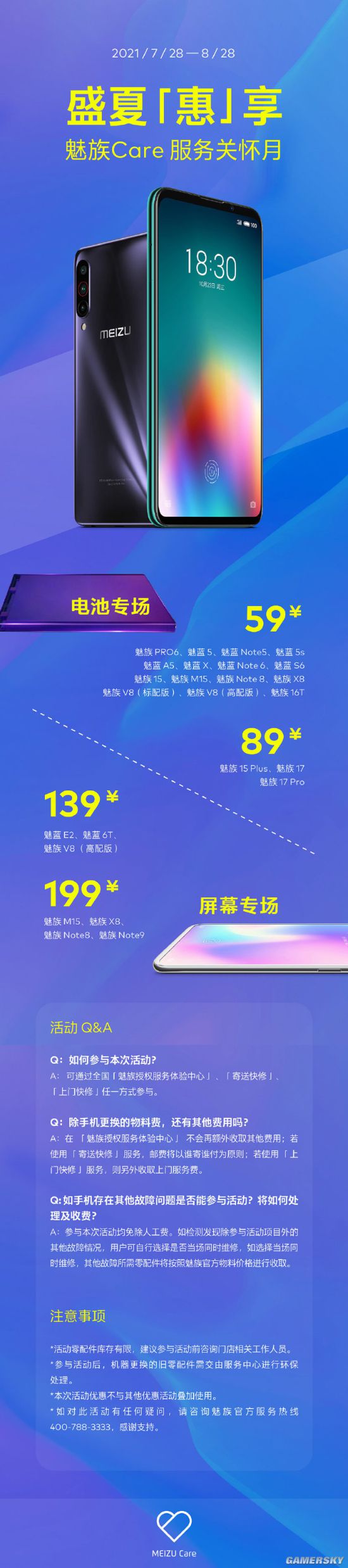 魅族Care关怀月活动开启 老机型换电池最低59元!