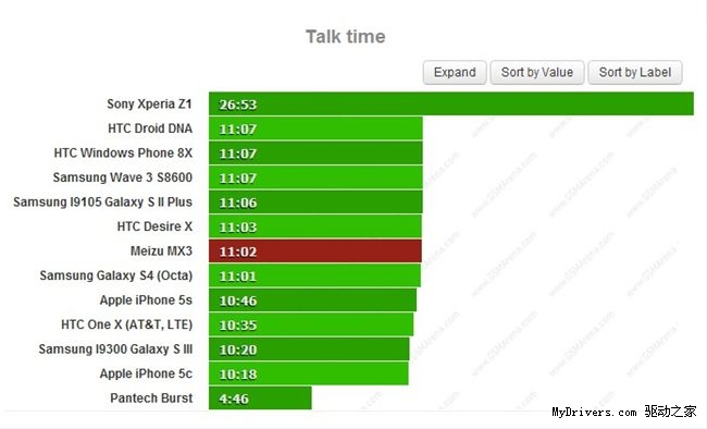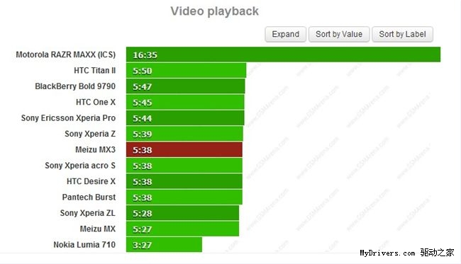 视频播放测试中,MX3仅坚持了5小时38分钟,要知道处理器相同的Galaxy S4都坚持了11小时以上,在这里MX3的表现实在是太不给力了。