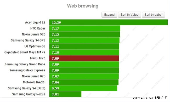 网页浏览测试中,MX3坚持了7小时9分钟,而Galaxy S4则坚持了6小时58分钟,表现依然还是持平。