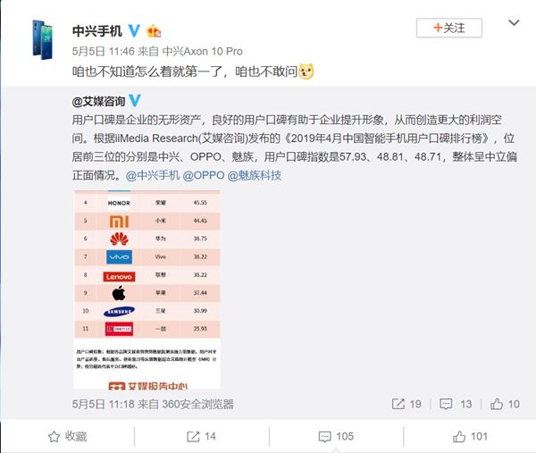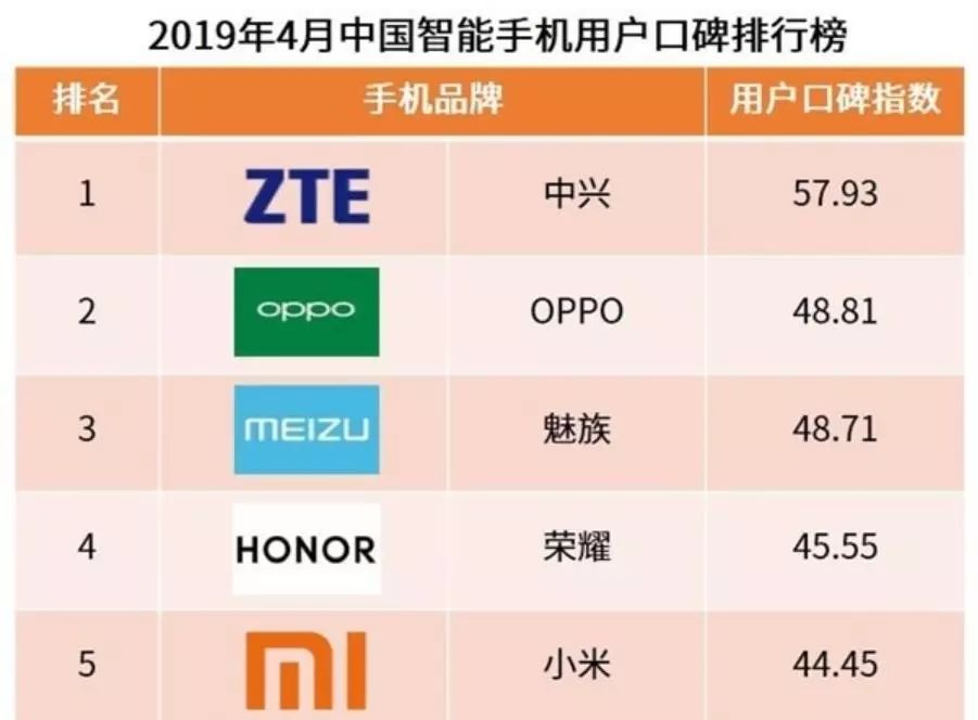 乐观的是,有第三方数据咨询机构发布了2019年4月智能手机用户口碑排行榜,中兴以57.93的分数位居第一。不止你懵逼,就连中兴也有点懵。随后在微博表示疑惑,还加了狗头保命,然而不管加不加狗头都阻止不了中兴已经成为others的事实。