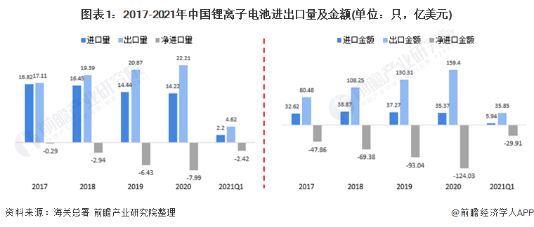 2017-2020年,从进出口量来看,中国锂离子电池进口量不断下降,出口量不断上升,净出口量持续增大。2020年,我国锂离子电池进口14.22亿只,出口22.21亿只,净出口7.99亿只。
