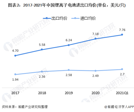 2021年一季度,我国锂离子电池出口均价达到7.76美元/只,进口均价回升至2.70美元/只。