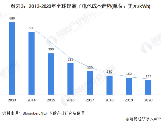 在成本方面,根据BloombergNEF统计数据显示,2020年,全球锂离子电池平均价格已降至137美元/kWh,较2013年下降近80%。随着锂电池成本的不断下降,锂电池在循环次数、能量密度、响应速度等方面具有的优势,将帮助锂电池打开在储能领域的应用空间。