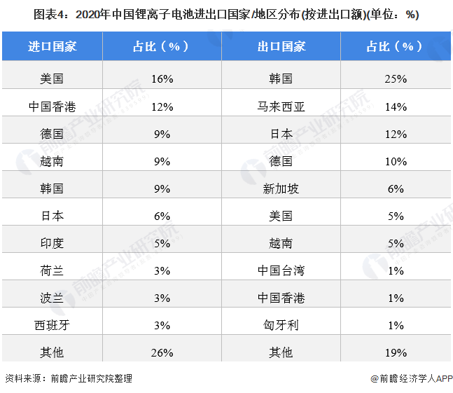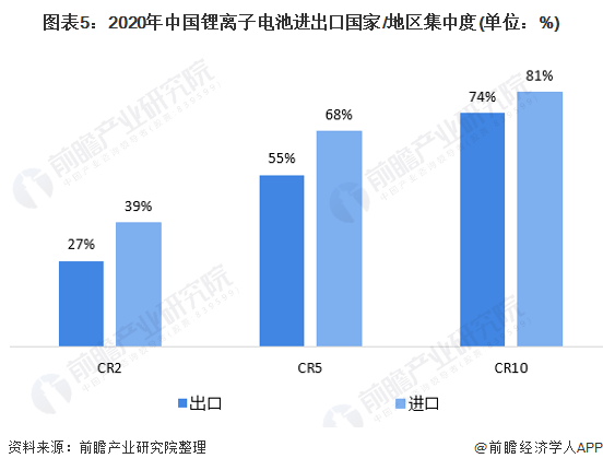 从进出口国的集中度来看,中国锂离子电池进口集中度略大于出口,2020年,锂离子电池进口CR5为55%,CR10达到了74%;锂离子电池出口CR5为68%,CR10超八成。