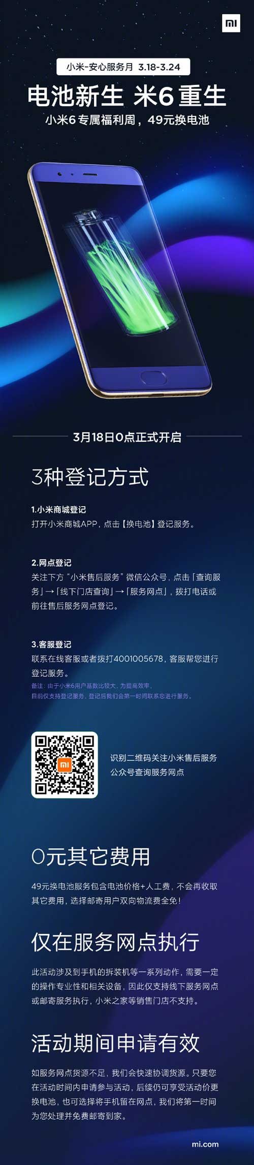 3月17日,今天小米手机官方微博发布消息,决定在 3 月 18 日- 3 月 24 日,设立米 6 用户专属福利周,专享 49 元换电池服务,小米6手机的用户可通过以下几种官方方式来预约更换电池。前不久小米也推出了49元换电池服务,但当时并没有小米6这款手机。对于不少小米6手机的需求,小米官方因此宣布针对小米6手机也推出49元换电池服务。