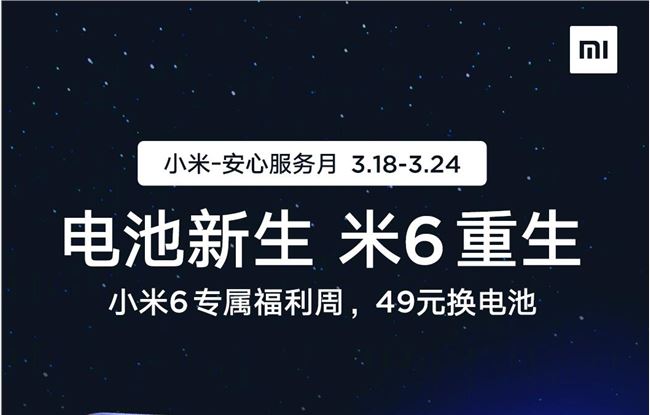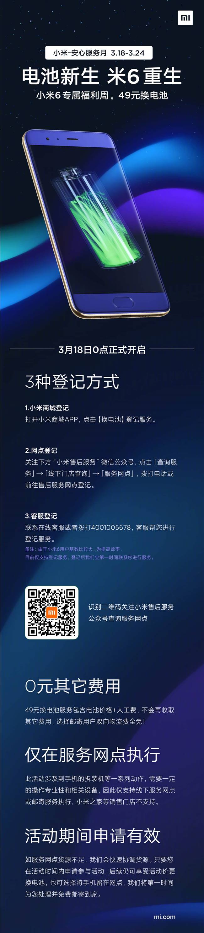 据介绍,小米 6 49 元换电池活动将从 3 月 18 日零点开始,用户可通过小米商城 App 登记、网点登记、客服登记 3 种方式参与此次活动。49 元换电池服务包含电池价格+人工费,无其他费用。同时相关操作仅支持线下服务网点/邮寄进行,销售门店不支持。