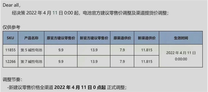 电池7 号和 5 号的官方建议零售价将由9.9 元提高到 13.9 元。而渠道供价从7. 9 元调整为11. 815 元。