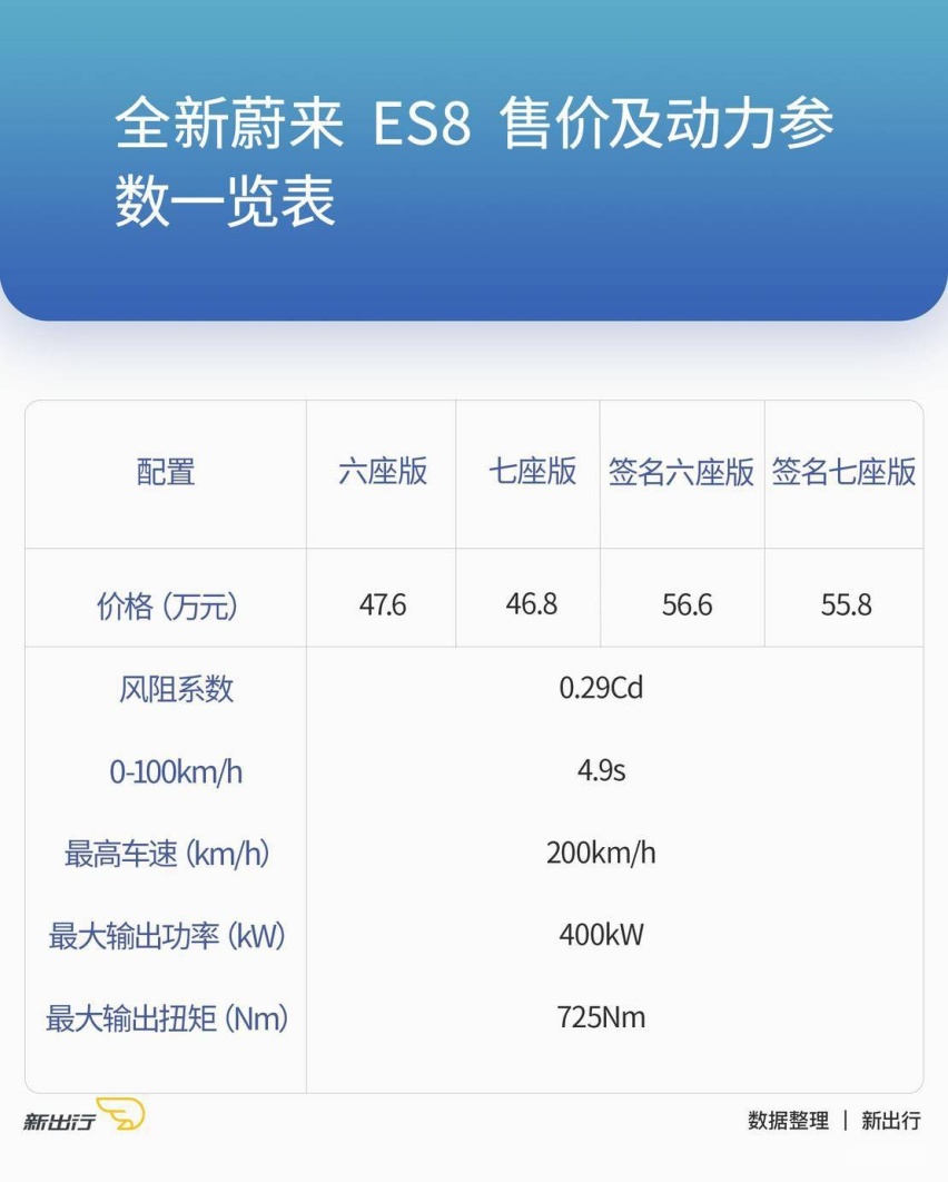 全新蔚来 ES8 提供六座和七座两种选择,补贴前售价区间为 46.8万-53.4万,其中 100kWh 电池包车型的交付时间为 2020 年第四季度。签名版车型非常好理解,即为在对应电池容量下的顶配款车型,售价区间为 55.8万-62.4万。