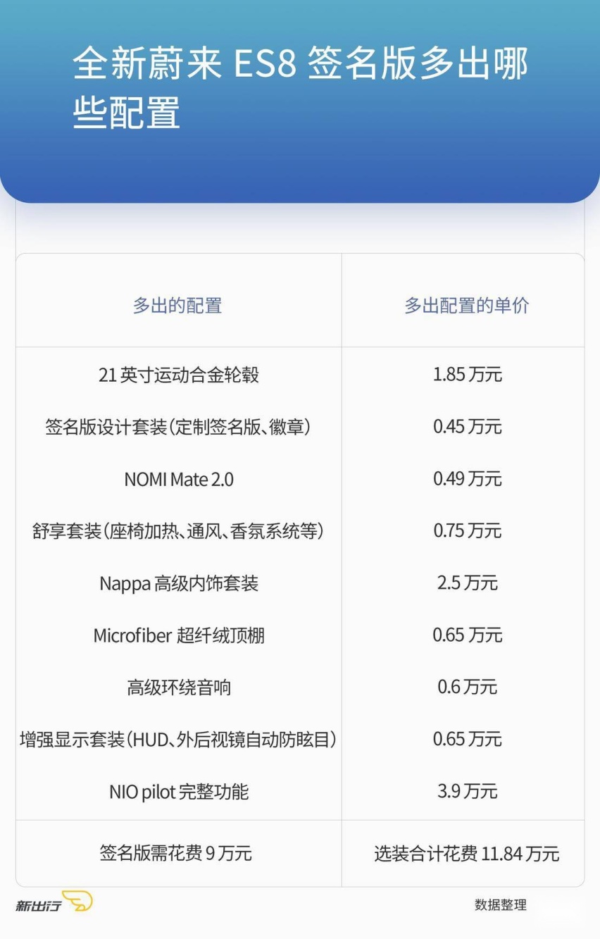 这 9 大项配置是任何配置车型都可以单独进行选装的,单独合计选装价格为 11.84 万元,因此如果你想要一台满配的全新蔚来 ES8 最好的方式就是直接购买签名版,因为这样你还可以节省 2.84 万元。如果觉得满配浪费可以自行进行单独选配,灵活性比较高。