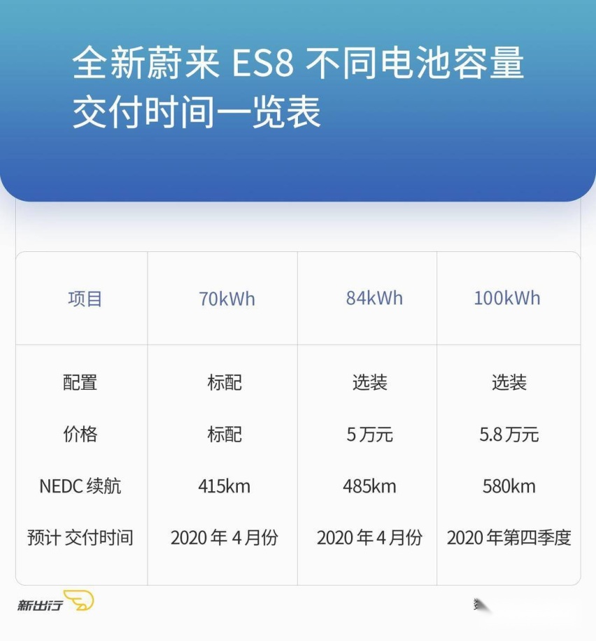 以全新蔚来 ES8 为例,蔚来汽车现在单就电池组已经有 70kWh、84kWh 和100kWh 电池组三个版本,ES8 三个电池组对应的续航里程分别是 415km、485km 和 580km。所以在选购全新蔚来 ES8 的时候还多了一个问题,该如何搭配电池组?