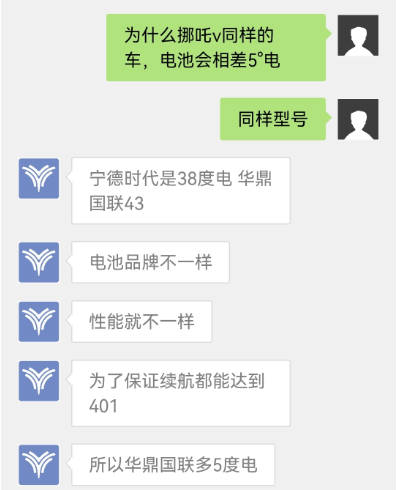 另一名北京车友丁先生也发现了同样的问题,购买的同款同价位的哪吒V长续航娱乐升级型,他的电池为安徽舟之航38.5度。“官方标称续航401公里,实测下来在200公里-250公里之间左右。按工信部百公里耗电11.8算,38.5/11.8=3.26。也就是理论续航326公里。”他后来了解到哪吒V的电池分为华鼎43度和舟之航38.5度。“华鼎的43度,理论就能365公里,加上动能回收,基本能差不多跑出来1:1的真实续航。而我的舟之航的电池38.5度严重虚标,续航成倍地往下掉。”丁先生怀疑,哪吒汽车用43度电池申报401续航获得国家大于400公里新能源补贴,后面混用38.5度电池来骗取补贴。他要求哪吒汽车为他更换43度华鼎电池,投诉了一年多,双方没有达成一致。