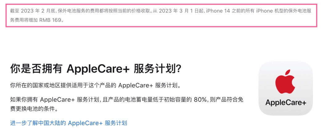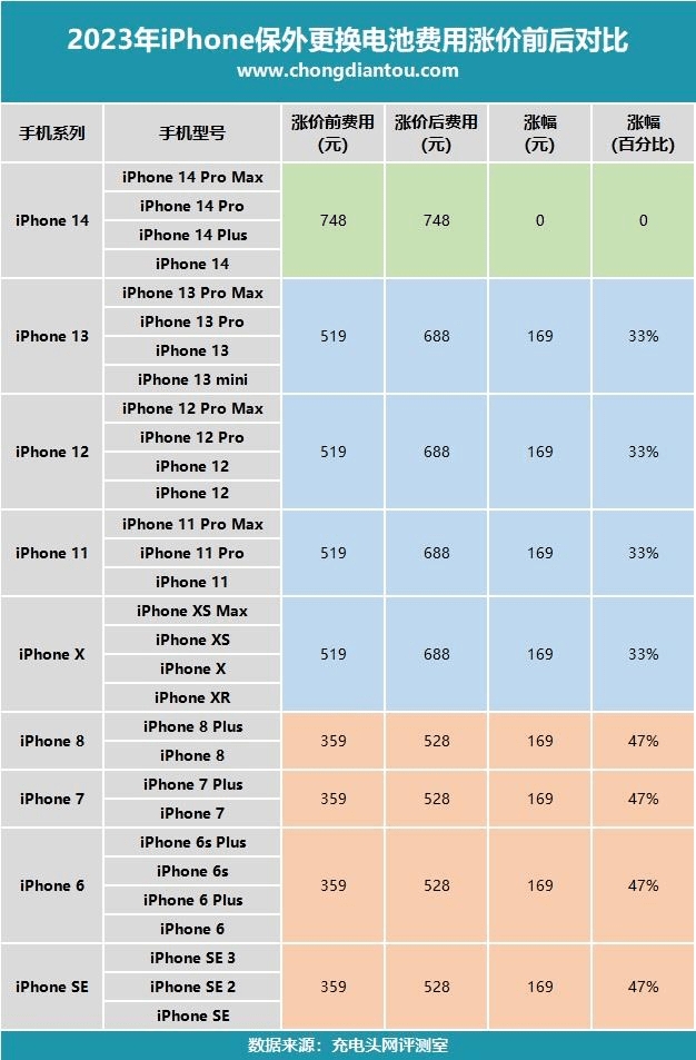 与此同时,苹果设备更换电池费用增长。官网显示,从2023年3月1日开始,iPhone14之前所有的iPhone机型的保外电池服务费用将增加169元。根据充电头网的统计,苹果设备换电池的费用与之前相比至少增长了33%。