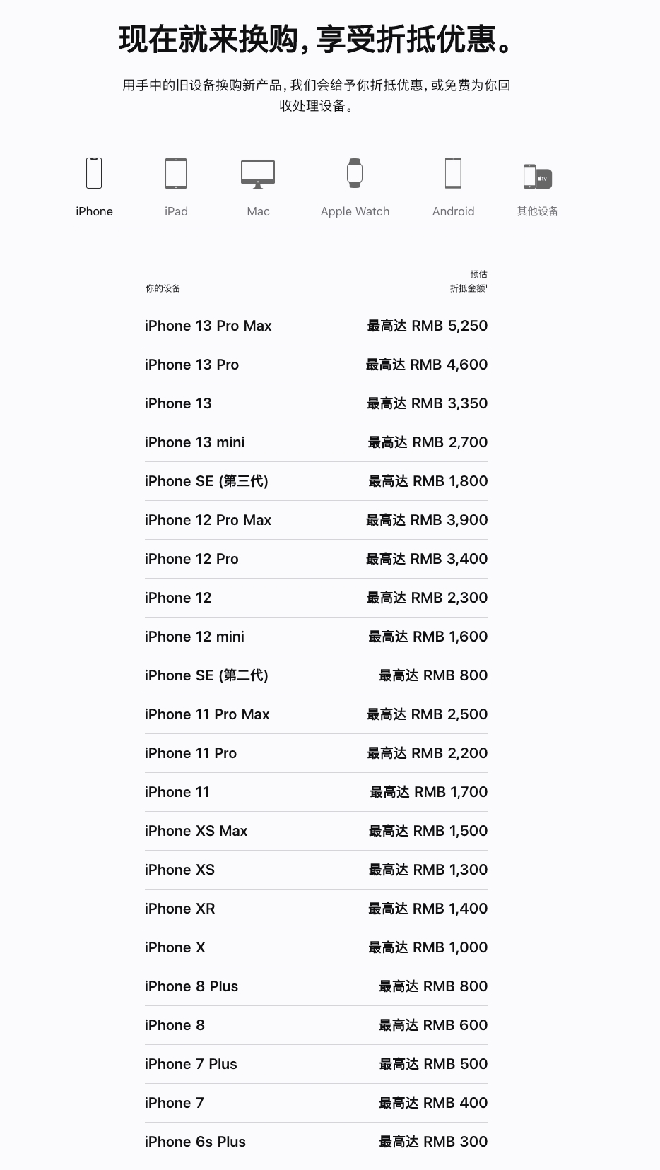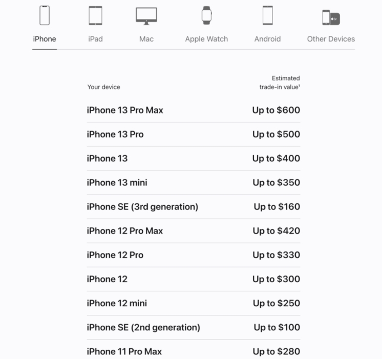 苹果中国官网于近日调整了TradeIn换购计划收费标准,回收价格有了不同程度的下降:iPhone13Pro价格下调了400元,iPhone13和iPhone12等机型均下调了200-300元不等。但苹果美国官网的TradeIn换购计划中包含的iPhone、iPad、AppleWatch以及MacBook等产品反而涨价了。