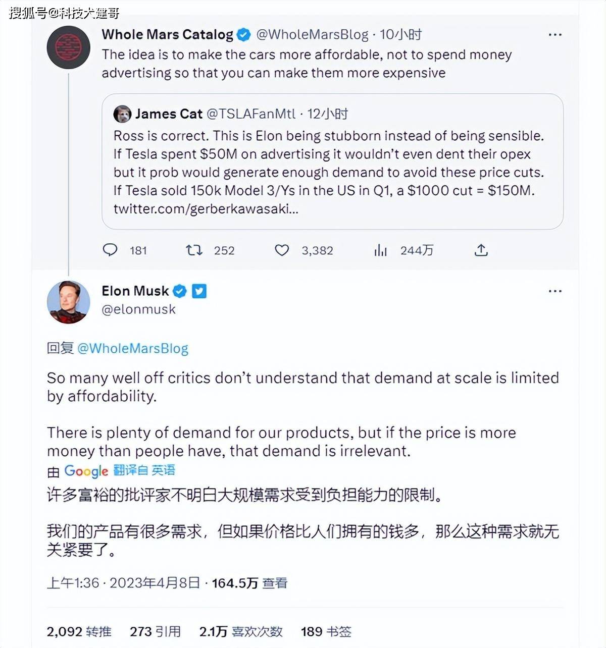 对此,马斯克也公开进行了回应,他表示,降价的原因不是大家对特斯拉没有需求,而是大家没钱负担不起,只有把车价降下来,才是真正的满足需求。
