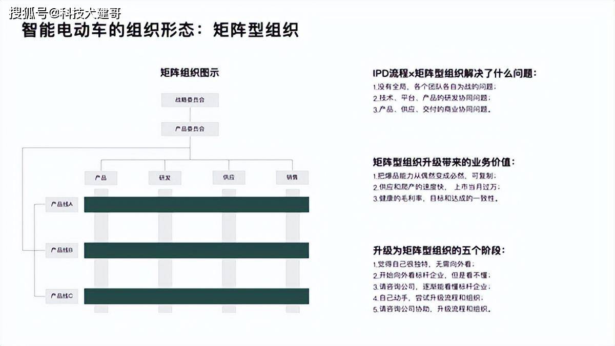 这是我们在过去实践中获得的验证,在此也和所有同行们做一个分享。作为一个智能电动车企业,IPD这样矩阵型组织的流程和管理方式是非常有效的。这不仅仅可以应用在最先进的IT公司里,同样也适用于汽车企业,包括智能电动车和传统汽车。