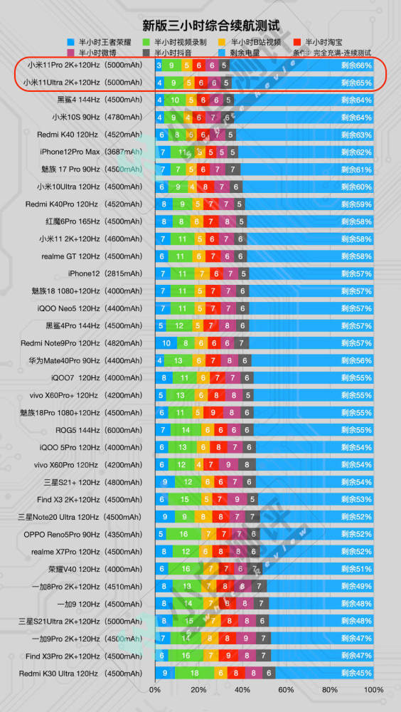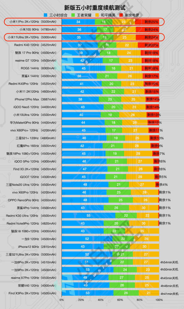 小白测评也放出了新版三小时综合续航和五小时重度续航测试的榜单,新发布的小米 11Pro 和小米 11Ultra 续航非常出色几乎霸榜。拥有 4600mAh 电池的小米 11 续航就已经不错,此次超大杯的两款新机电池容量提升到 5000mAh,续航优秀也是意料之中。
