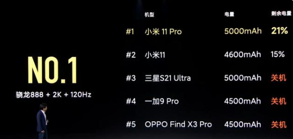 在发布会上,雷军就已经公布了小米 11Pro 的续航表现,和同样使用 2K 分辨率和 120Hz 刷新率的手机相比,小米 11 和小米 11Pro 都大幅领先,机型都有续航翻车的情况。