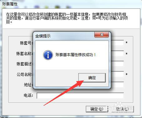 6.点击确定后,页面会弹出提示:账套基本属性修改成功,这样就表示:金蝶账套的名称已更改成功了,点击小对话框中的确定;